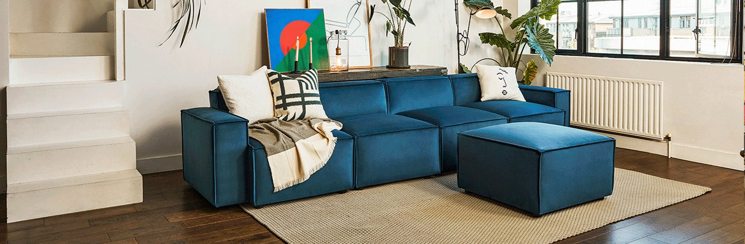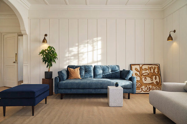Our best-selling colour for a reason. Deep blue velvet sofas are eye-catching, and deeply comfortable, and can be paired with any living room interior.