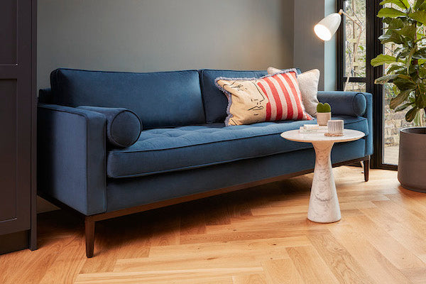 Die typischen Merkmale eines Sofas im Mid-Century-Stil sind zum Beispiel die schmal zulaufenden Beine (die oft aus Massivholz bestehen), die Kissen mit Knopfsteppung und die Paspelierungen. Bei den Bezügen ist Samt eine ebenso beliebte Wahl wie Kunstleder mit klassischem Look.