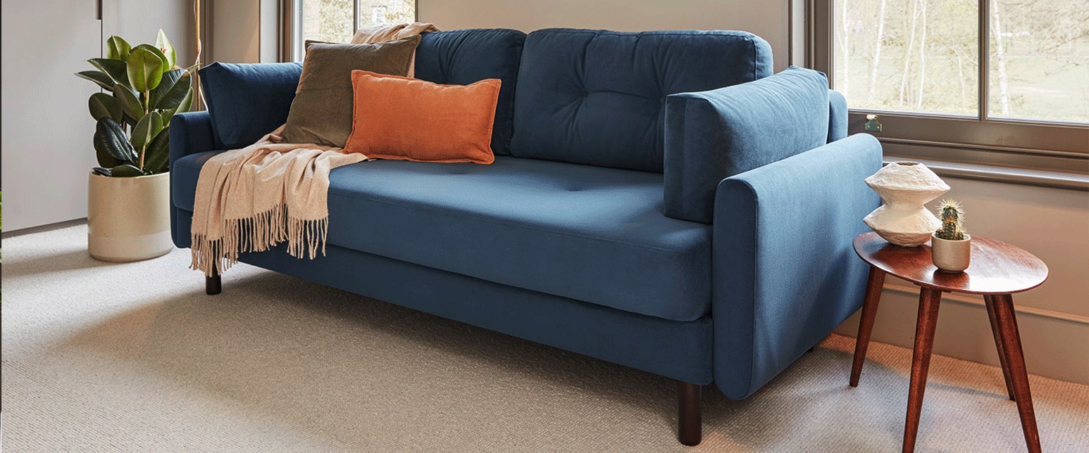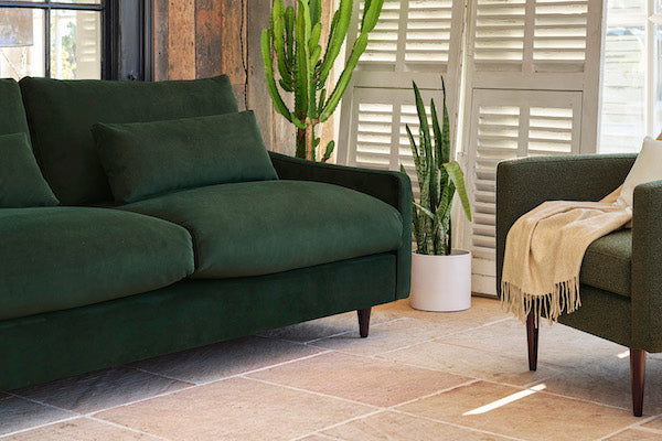 Samt-Sofas sind sehr stilvoll und wunderbar weich. Sie verleihen deinem Wohnzimmer einen Hauch Luxus und sind in vielen verschiedenen Designs und Farben erhältlich. Da Samt ziemlich auffällig und dick ist, empfehlen wir, für andere Accessoires leichtere Texturen zu verwenden. Samtkissen harmonieren gut mit einer Couch aus Samt. Ansonsten solltest du es jedoch schlicht und minimalistisch halten. Lies unsere Styling-Tipps für Samt, um mehr zu erfahren.