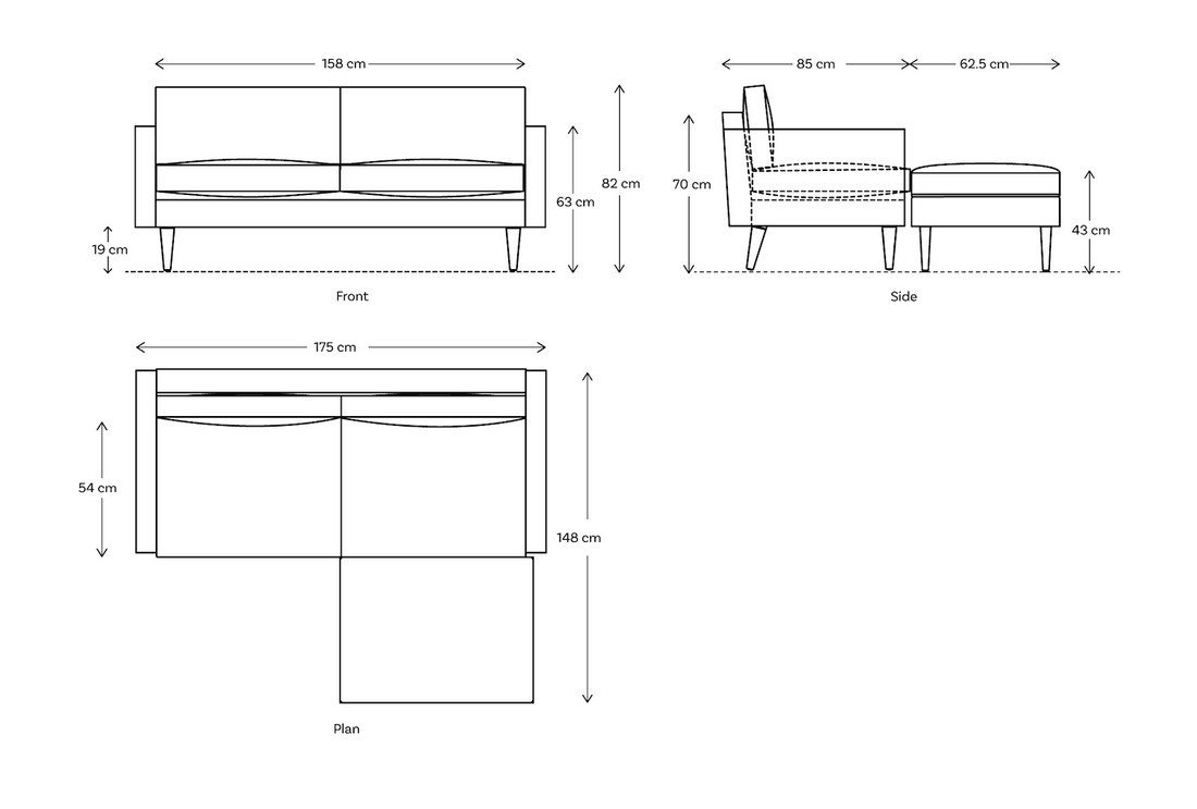 The Model 01 2-seater right chaise sofa is a minimalist, mid-century style corner sofa, available in a range of fabric colours.