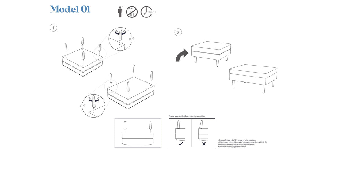 The Model 01 ottoman's mid-century design pairs with the Model 01 sofa for a match made in interior heaven. Whether you're stretching out in front of the TV, providing extra seating for guests, or using it as a substitute coffee table, Model 01 has got you covered.