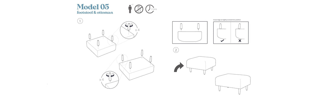 Designed to follow the Model 05's minimalist design, the ottoman allows you to fully relax into the sofa whilst giving your feet and legs room to spread.The Model 05 ottoman sits at the same height as the sofa and loveseat, allowing you to turn the sofa into a corner or the loveseat into a chaise lounge. Assembly is pain-free, it only requires screwing four legs into the base. For extra comfort, the cushion is made from the same high-density foam as the Model 05 sofas.