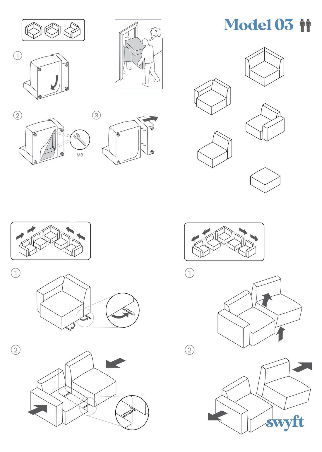 In deinem Wohnzimmer bestimmst du die Regeln. Egal ob Zweisitzer oder Zehnsitzer, linke oder rechte Ecke, mit oder ohne Polsterhocker – stelle das passende Sofa für dein Zuhause und deinen Lifestyle zusammen. Das Dreisitzer-Sofa Model 03 mit Chaiselongue auf der rechten Seite ist eine Kombination aus einem Modul mit linker Armlehne, einem Modul mit rechter Armlehne, einem Einsitzer-Modul und einem Polsterhocker. Die Module verfügen über ineinandergreifende Clips am Gestell sowie Massivholzfüße mit Kunststoffkappen, damit sie nicht verrutschen.