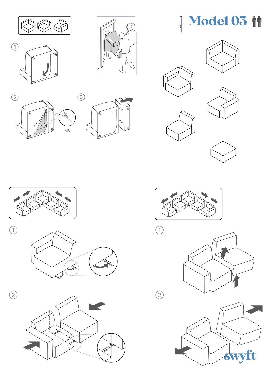 In deinem Wohnzimmer bestimmst du die Regeln. Egal ob Zweisitzer oder Zehnsitzer, linke oder rechte Ecke, mit oder ohne Polsterhocker – stelle das passende Sofa für dein Zuhause und deinen Lifestyle zusammen. Das Ecksofa Model 03 ist eine Kombination aus einem Modul mit linker Armlehne, einem Modul mit rechter Armlehne, zwei Einsitzer-Modulen, einem Eckmodul und einem Polsterhocker. Die Module verfügen über ineinandergreifende Clips am Gestell sowie Massivholzfüße mit Kunststoffkappen, damit sie nicht verrutschen.